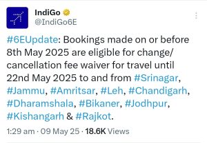 ” भारत और पाकिस्तान के बीच बढ़ते तनाव को देखते हुए इंडिगो ने चंडीगढ़ और श्रीनगर सहित कई शहरों में बुकिंग रद्द करने की फीस 22 मई तक माफ करने की घोषणा की है “